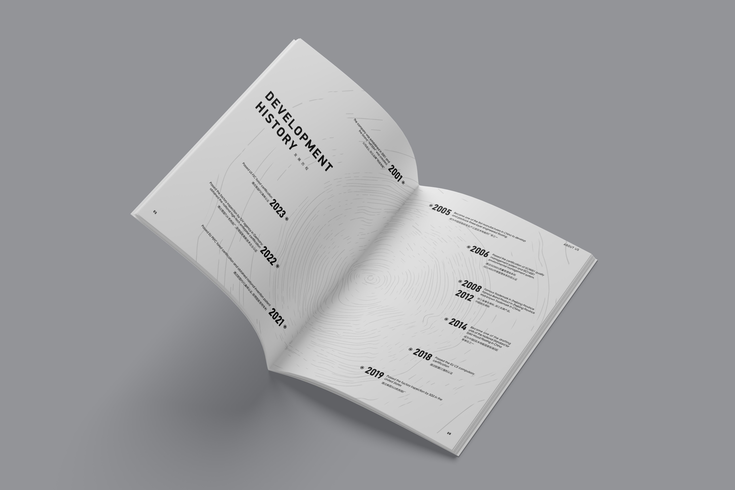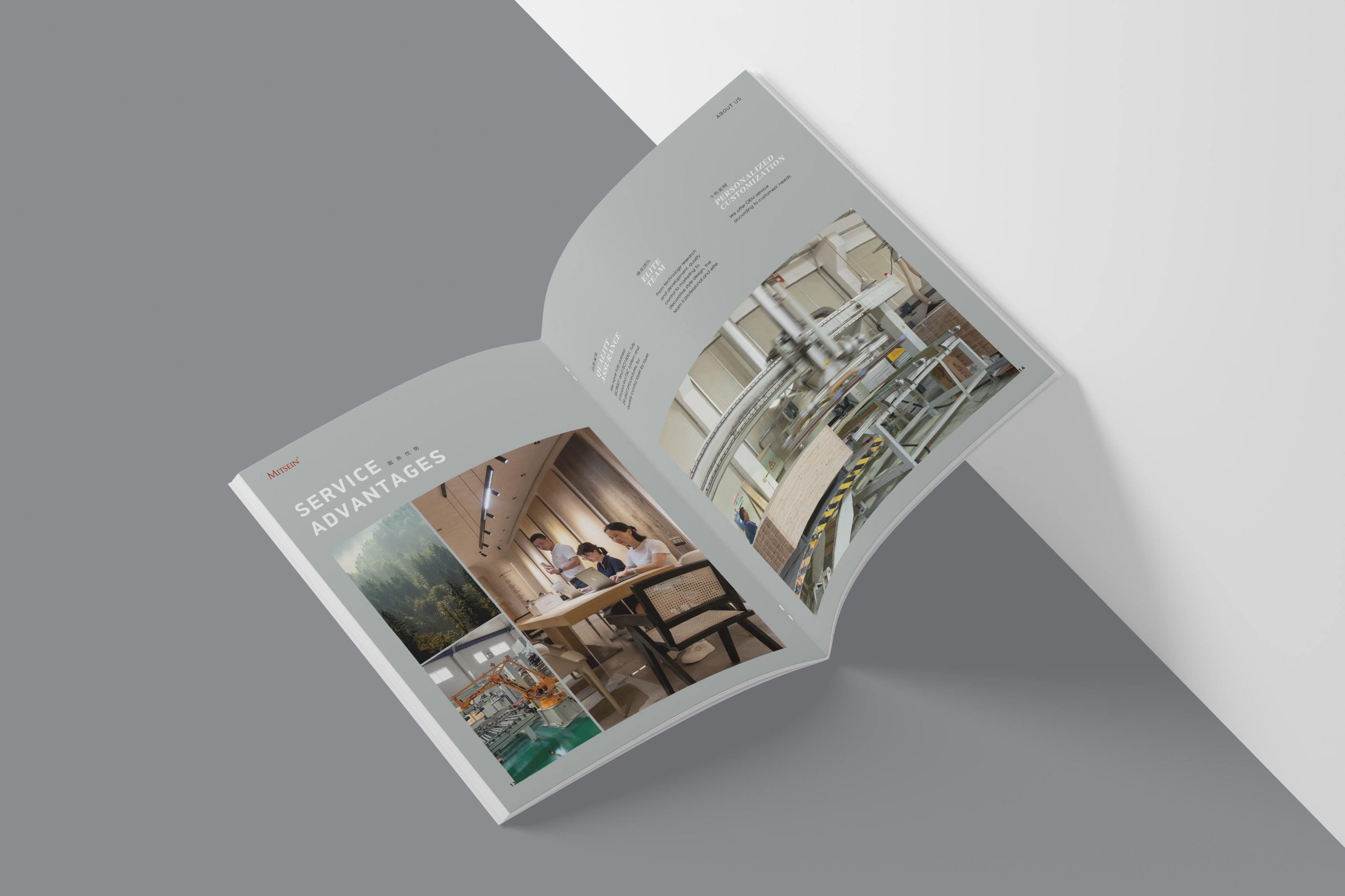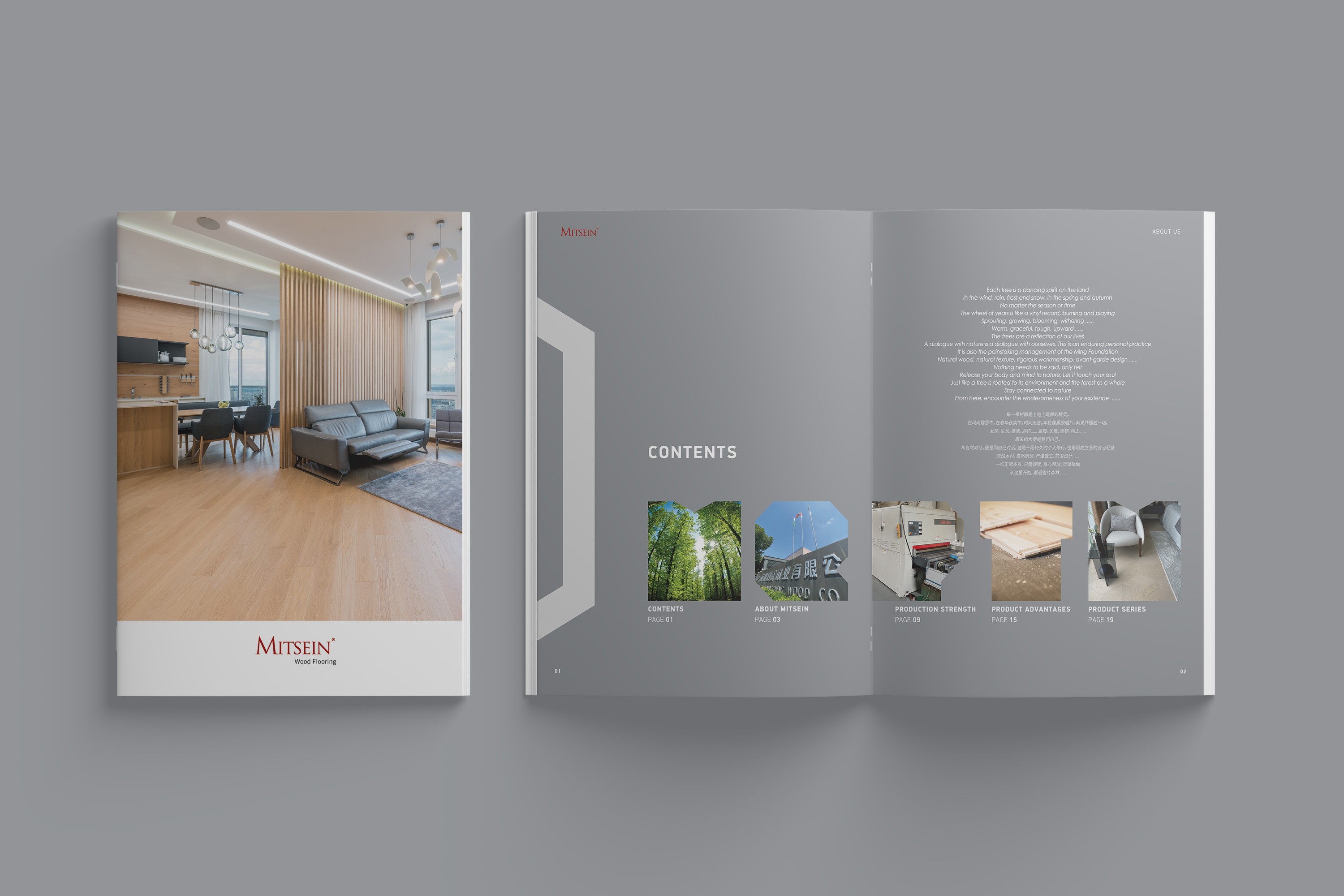 淺木色與灰色為主要色彩,既展現出明成木業的企業行業屬性,又具備自然環保的特征,色調大體一致,極具整體感。
