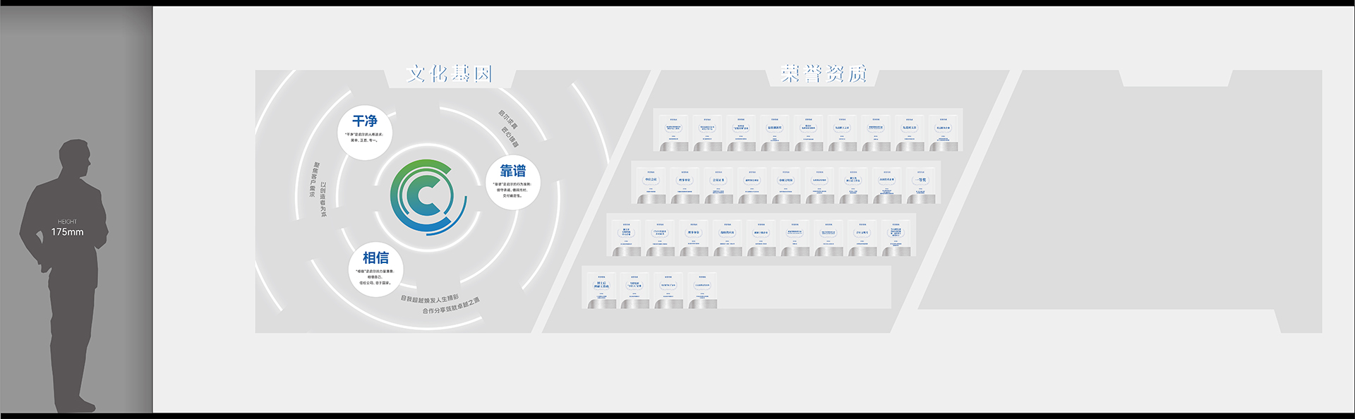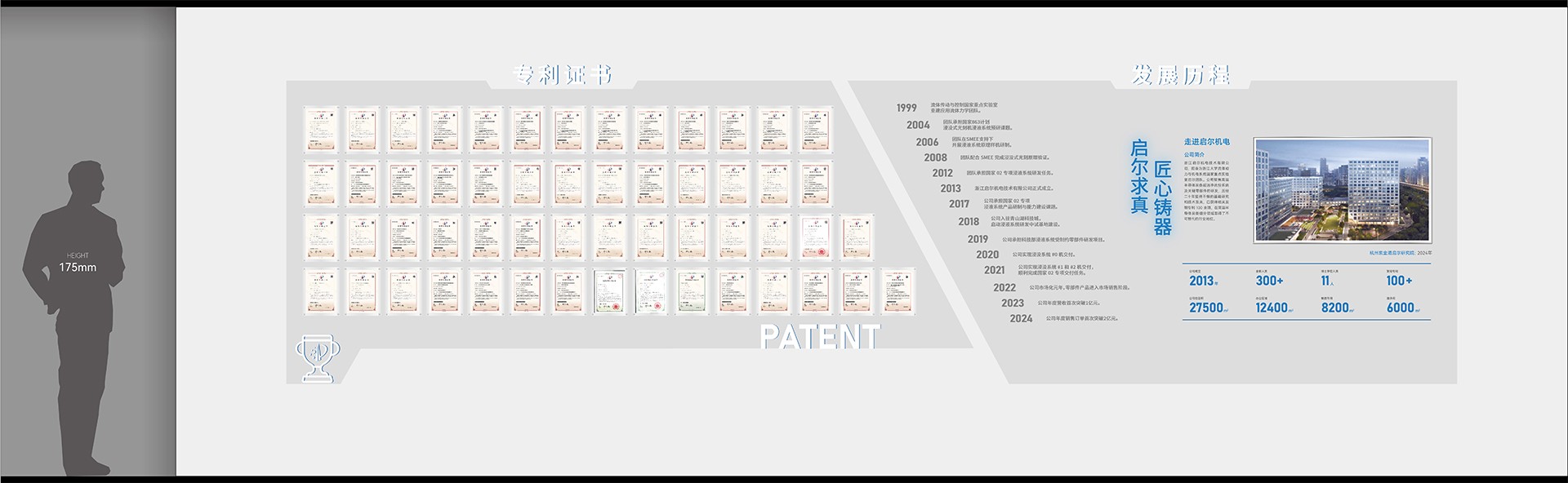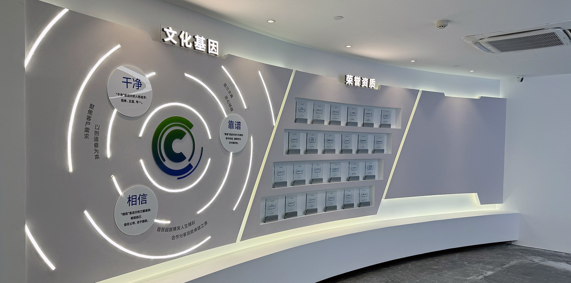 2. 2. 序廳(品牌形象區)設計元素:采用高科技感的LED大屏播放公司宣傳片,結合動態光影效果,營造震撼的視覺效果。墻面設置企業形象墻,展示公司歷史沿革、榮譽獎項及核心團隊介紹。亮點:設置AR互動裝置,參觀者可通過手機或特定設備掃描二維碼,虛擬體驗公司發展歷程中的重要時刻。