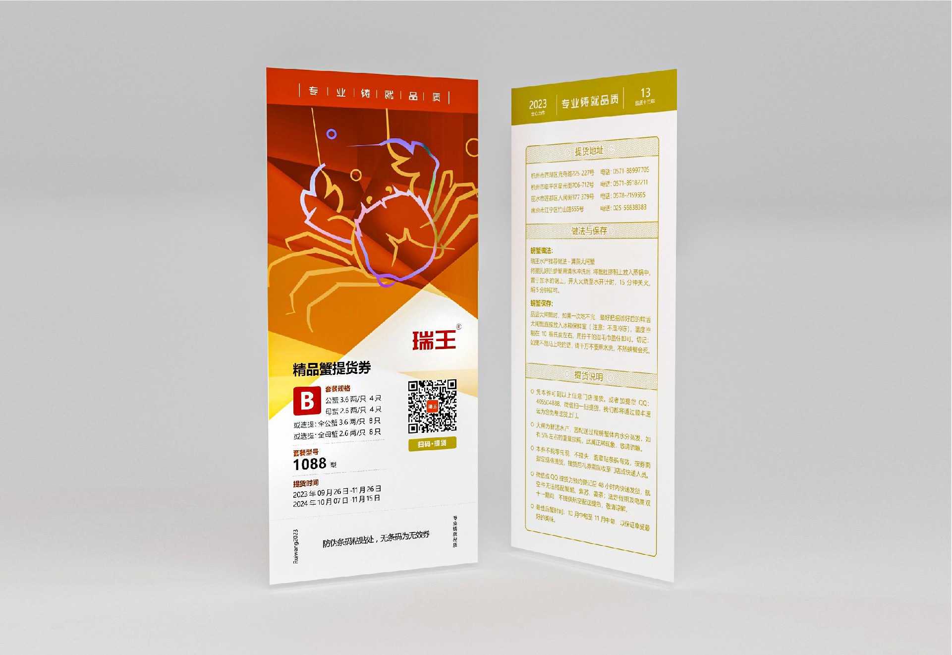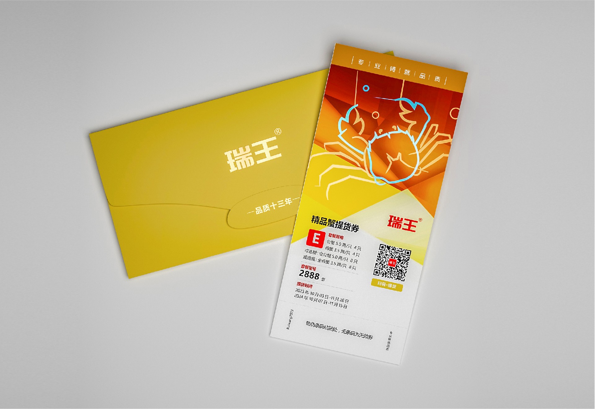 采用信封式包裝,以黃色為主色調(diào),代表大閘蟹的鮮美。在信封的正面上部印有瑞王大閘蟹的LOGO,以突出品牌形象,并附上“品質(zhì)十三年”的口號,展示企業(yè)的信譽(yù)度。