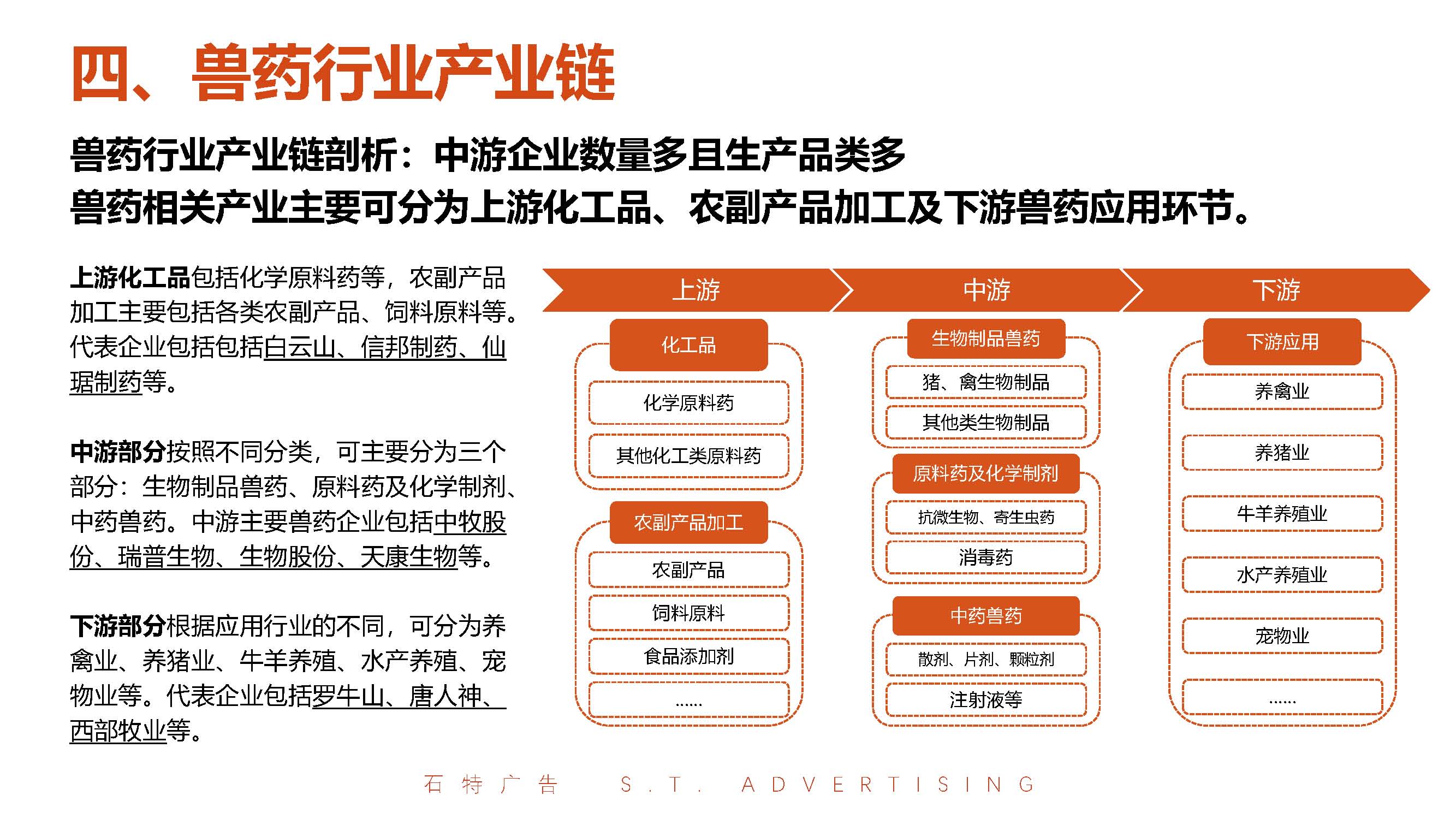 我們從企業定位、企業文化、現有產品等方面出發分析了瑞普生物、海利、華畜等獸藥代表性企業:瑞普生物屬于大而全,無論是生產實力、技術水平、經營范圍、銷售區域、還是品牌影響力,都具有絕對的市場話語權;海利生物屬于精而深,通過細分市場,精準定位為獸用生物制品領域,通過全產業鏈一體化能力做到一厘米寬,一公里深,也收獲了巨大的成功,并站穩區域市場;華畜以更正規更低價作為品牌定位,線上線下整合,依托電商成功爆發,打造了互聯網品牌陣地,實現了聲量銷量的雙豐收。