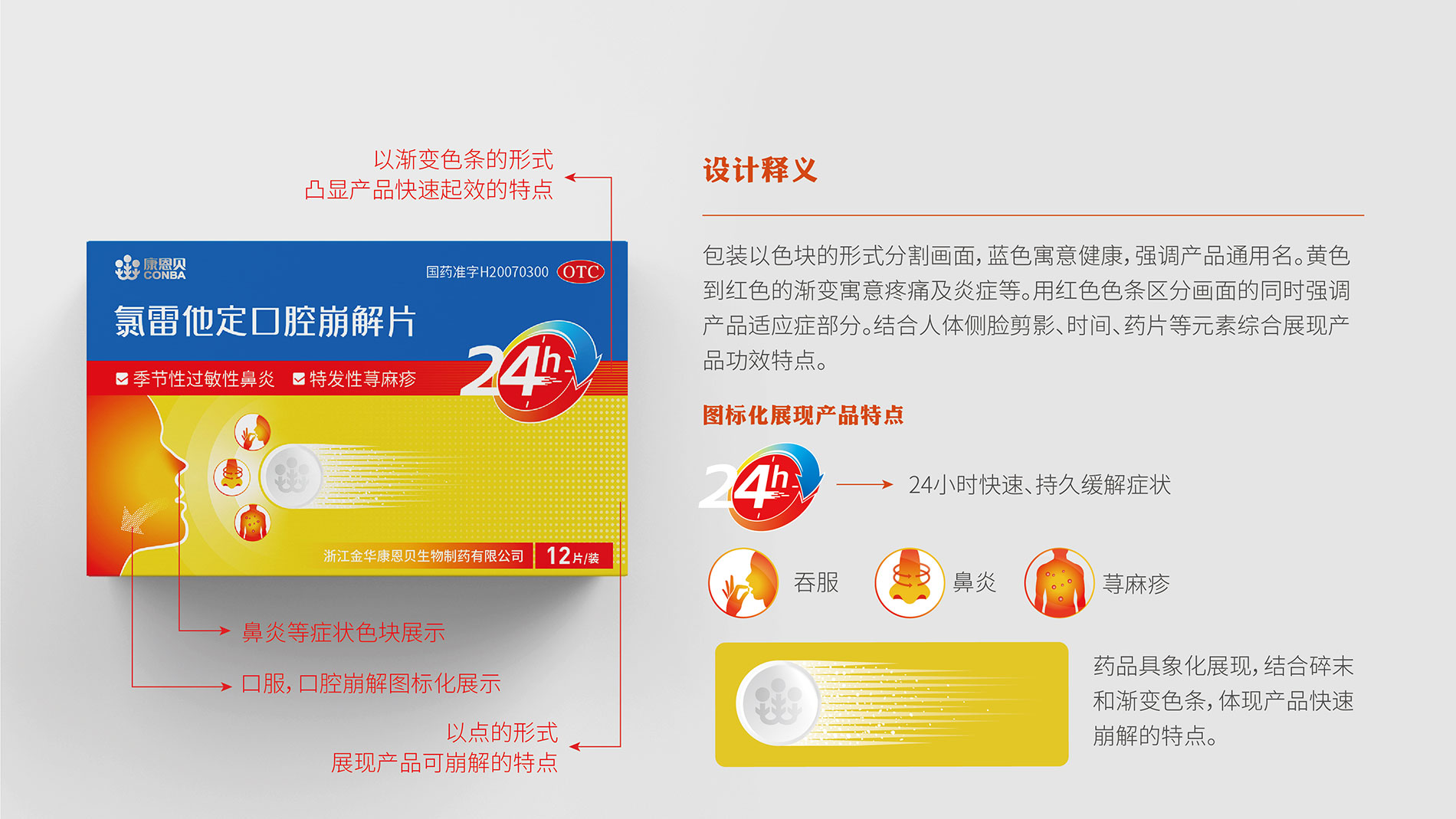 包裝以色塊的形式分割畫面,藍色寓意健康,強調產品通用名。黃色到紅色的漸變寓意疼痛及炎癥等。用紅色色條區分畫面的同時強調產品適應癥部分。結合人體側臉剪影、時間、藥片等元素綜合展現產品功效特點。