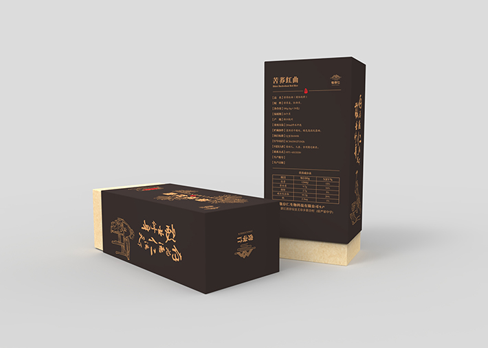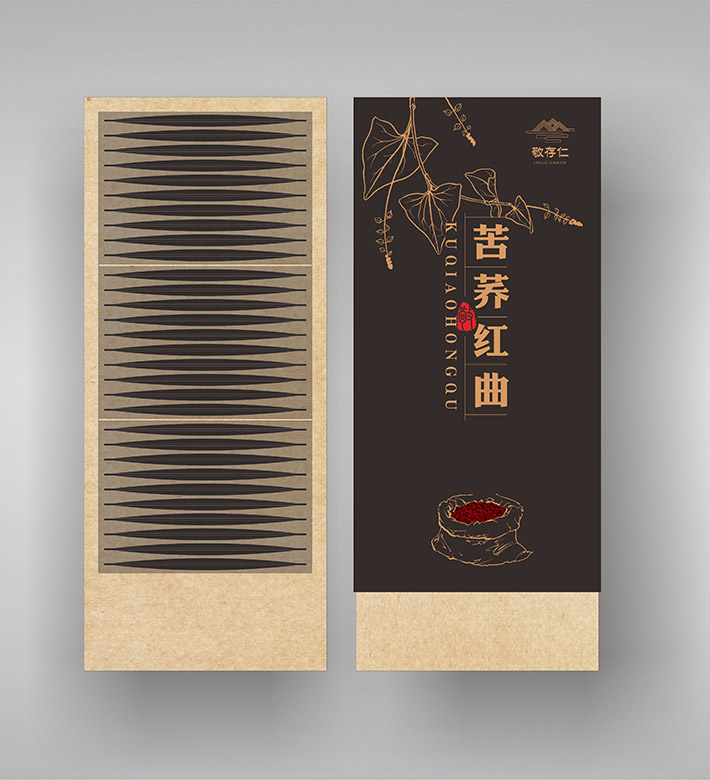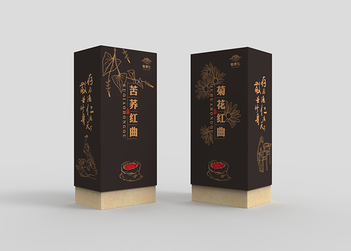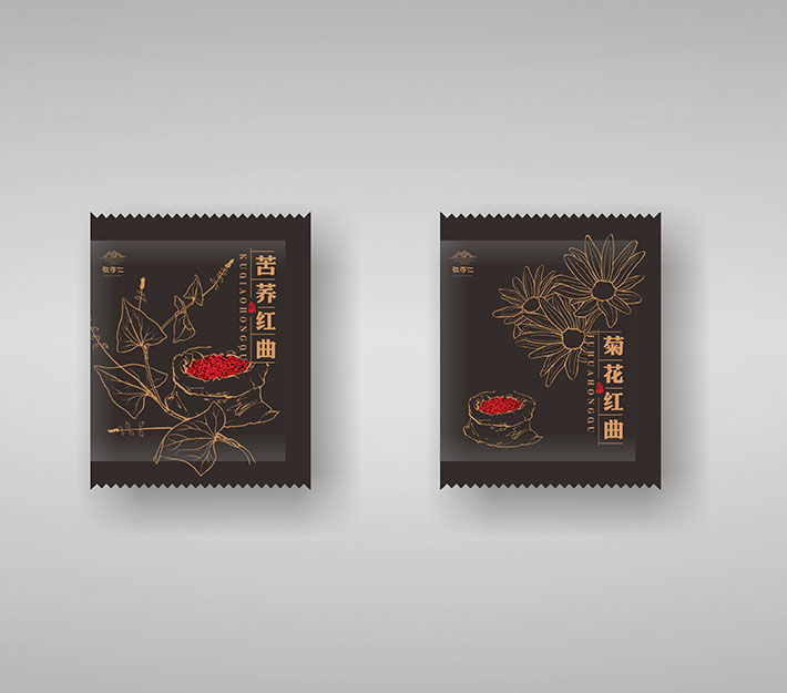 紅曲系列是敬存仁生產產品中的一個系列,它有苦蕎紅曲和菊花紅曲,石特為它做了全面的包裝策劃。這個系列產品仍然延續其它系列產品風格采用全原創手繪設計,該系列下兩款產品整體風格相同,不同產品名字手繪不同植物的形狀加以區分,這樣整體顯得統一而又便于區分。