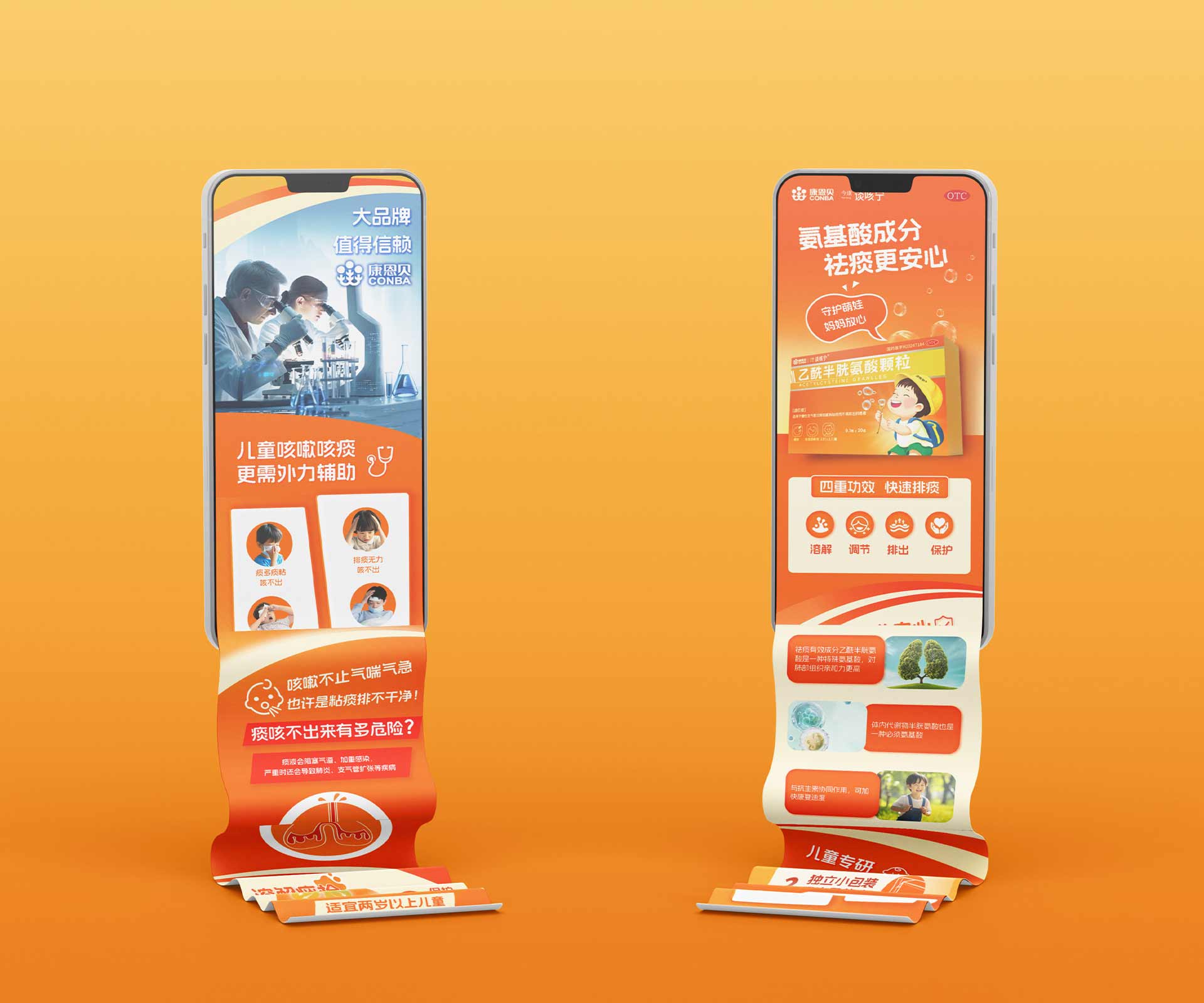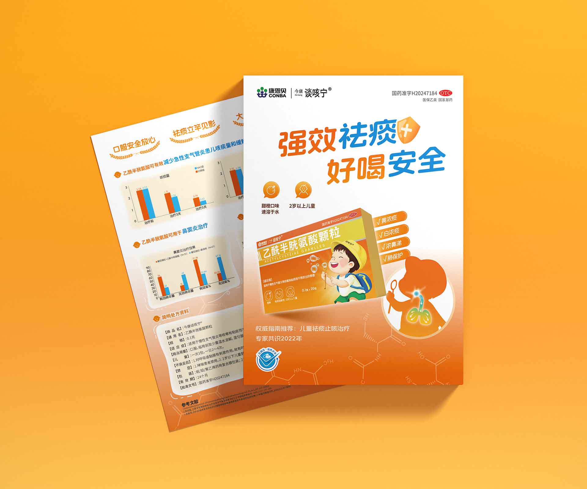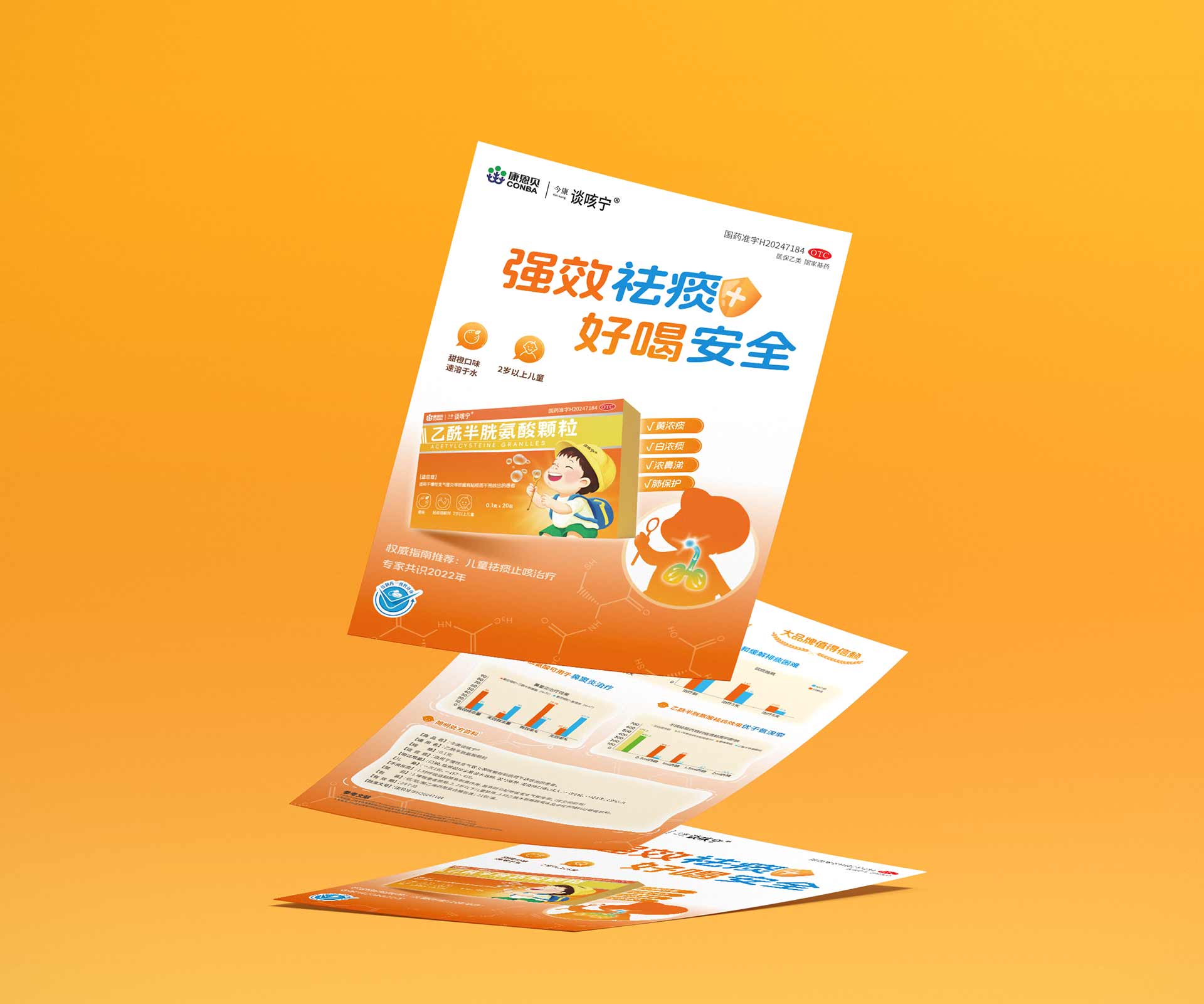 • 背面:聚焦 “3 大核心優勢(強效祛痰、好喝安全、臨床驗證 )”+“1 套解決方案(適用癥狀 + 使用方法 )”,用簡潔排版、 icon 符號(如橙子代表口味、盾牌代表安全 ),讓家長 10 秒獲取關鍵信息,適配藥店陳列、展會分發等快節奏場景。