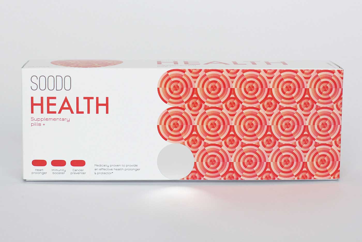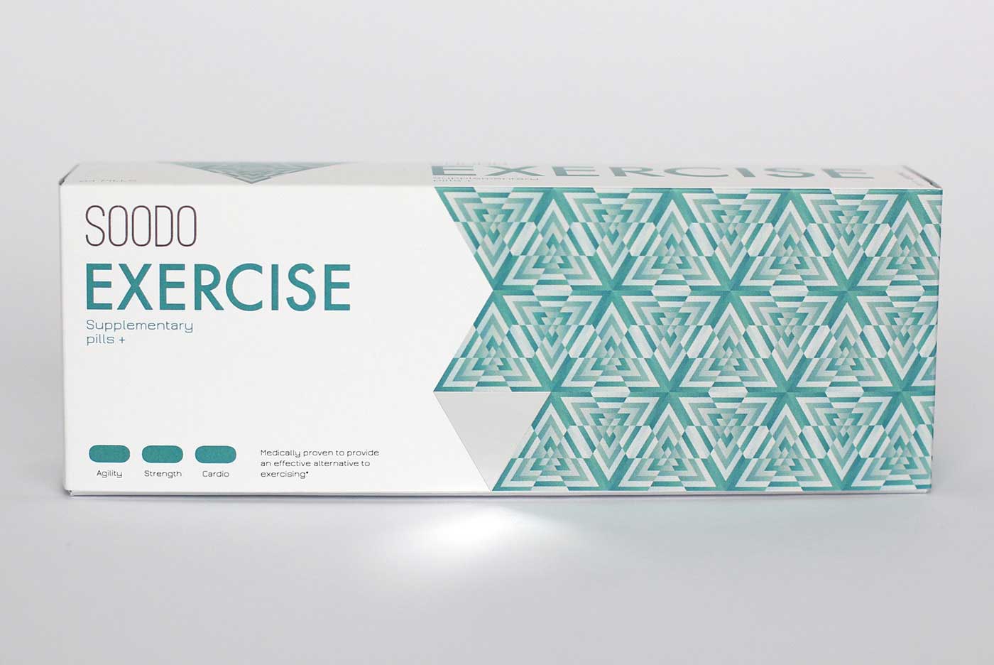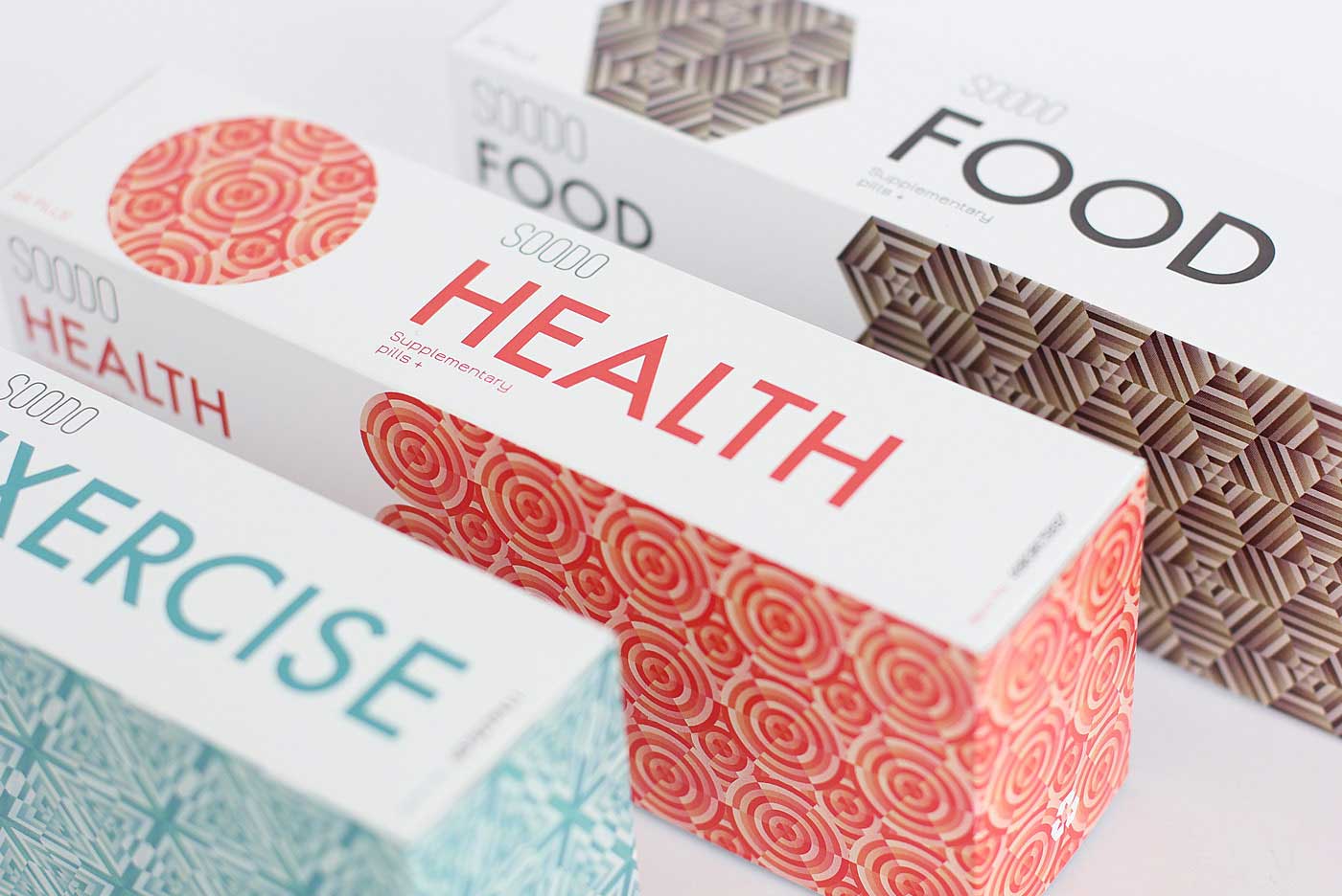 品牌名稱“SOODO”是通過將原始詞“偽”的發(fā)音,即不假的,有誤導(dǎo)性的。消除創(chuàng)造健康生活的所有自然方式的想法,導(dǎo)致失去與這些活動(dòng)相關(guān)的重要的社會(huì)互動(dòng)。我想要設(shè)計(jì)方法來反映這樣一個(gè)悲劇的后果。產(chǎn)品包裝采用幾何圖形進(jìn)行設(shè)計(jì),用漸變的方法使圖案更抽象化,表達(dá)補(bǔ)藥對人體產(chǎn)生的微妙變化。